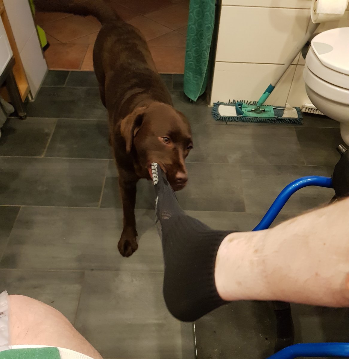 Natürlich machen wir auch ein paar Grundübungen, z.B. das Socken ausziehen klappt sehr gut und es gibt auch nicht mehr so viele Luftlöcher.